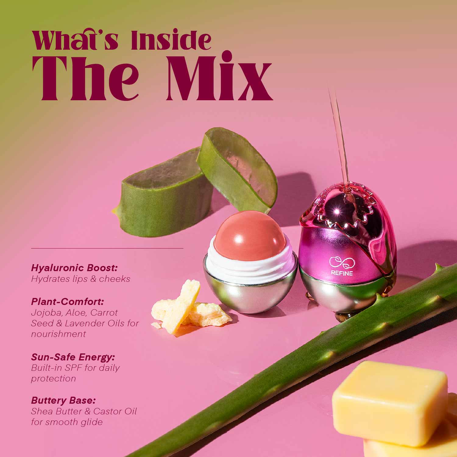 Hyaluronic enriched, jojoba & castor oils, carrot & lavender oils, SPF.